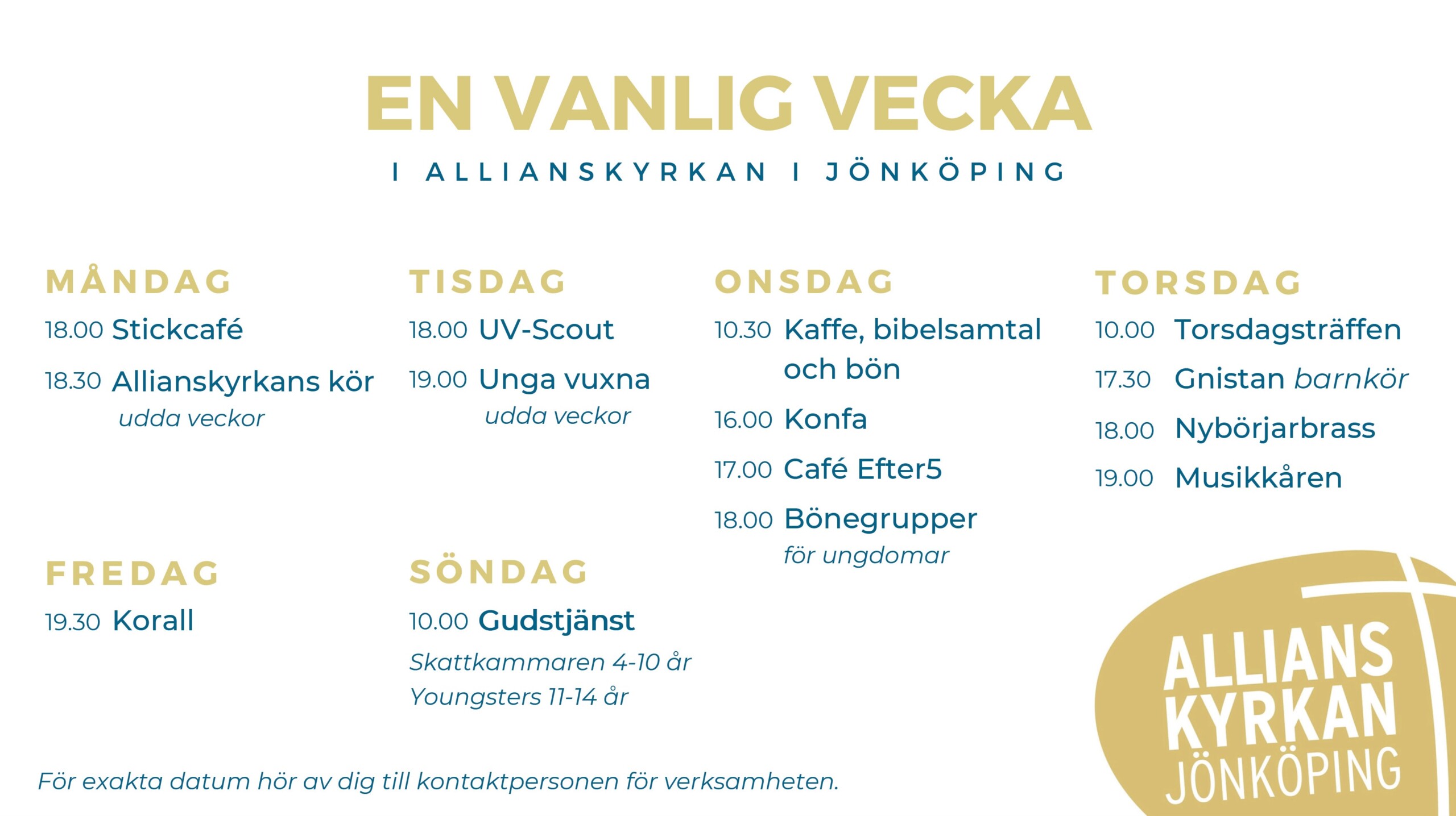Välkommen på en gudstjänst i tre delar på temat “Drömmar“. 1. Intro. Samling i caféet (Östergården) – Rickard Thoursie och Johanna Lantz medverkar. 2. Samtal vid borden och i mindre grupper. 3. Lovsång, bön och ljuständning i kyrksalen. Christer Ramefelt medverkar. Församlingsmöte efter kyrkkaffet.
