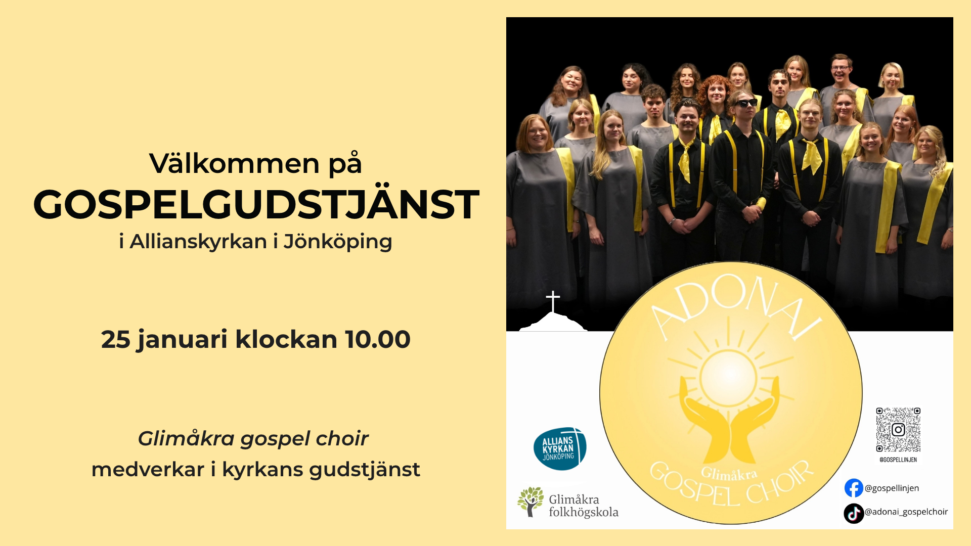 Välkommen på en svängig gospelgudstjänst med Glimåkras gospelkör Adonai. De kommer till Allianskyrkan 25 januari och medverkar i vår Gudstjänst klockan 10.00. Fritt inträde då det är en "vanlig" Gudstjänst.
