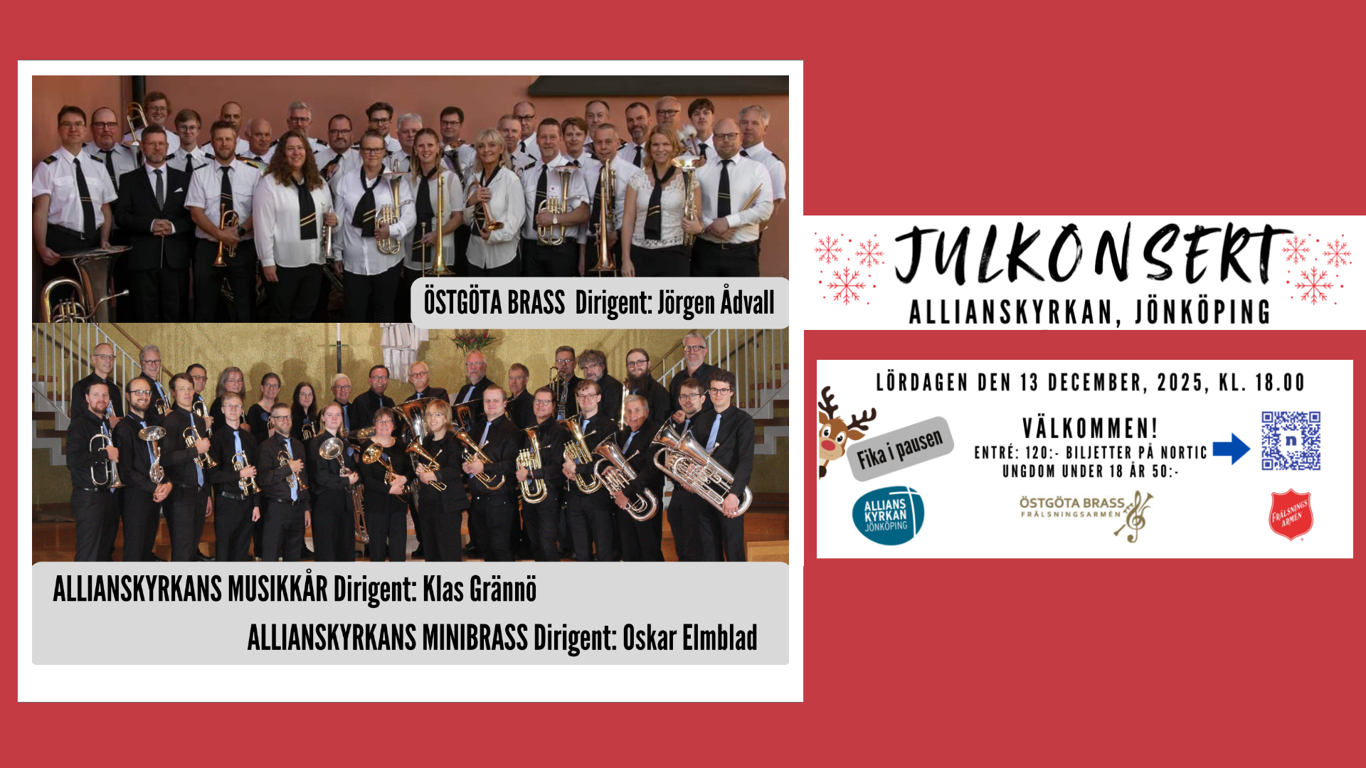 Välkommen på en konsert med brassbandsmusik i julens tecken med Allianskyrkans Musikkår, Minibrass och Östgöta Brass från Frälsningsarmén. Lördag 13 december klockan 18.00 i Allianskyrkan i Jönköping.